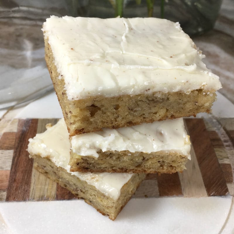 Let the bars cool 10-15 minutes before frosting. Dollop the frosting over the warm bars and spread in an even layer. If the bars are too warm, they will just drink up the frosting and it won’t sit on top the way you want- so be patient!